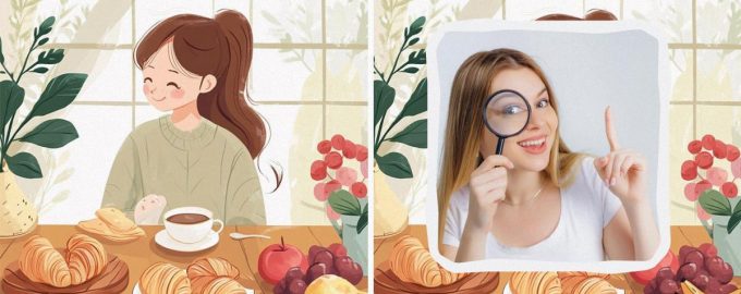 На снимките се вижда симпатично момиче, което се наслаждава на закуска в кухнята си. Тя пие кафе (или чай) с вкусни кроасани. А за десерт от нея се очаква да хапне фрути. Изображенията изглеждат почти идентични, като между тях има четири фини разлики. Ще успеете ли да ги откриете?